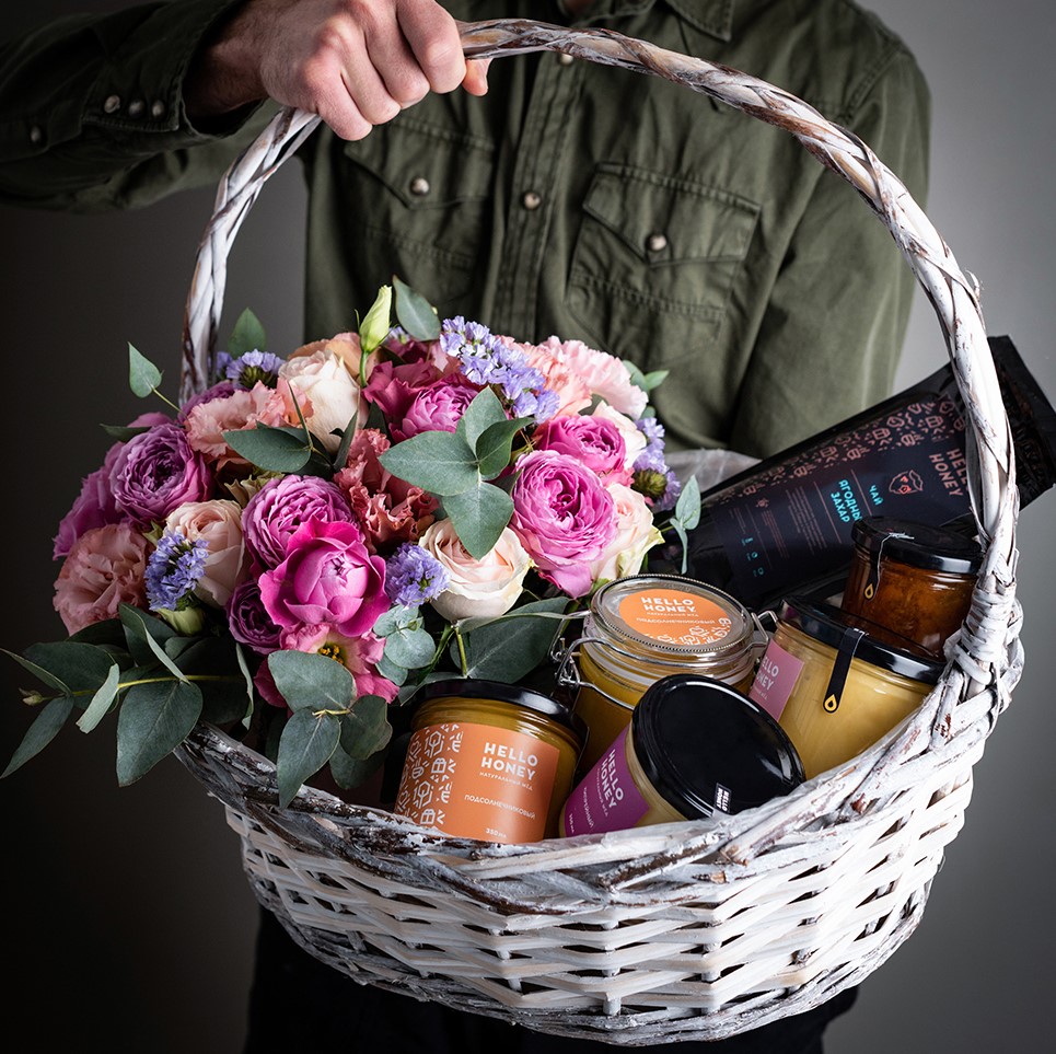 В набор входит: натуральный мёд, крем-мёд, домашнее варенье и пакет травяного чая. Мы поможем составить идеальное сочетание, которое подойдёт для вашего случая.Настоящее украшение корзины — букет живых цветов. В композицию входят пионовидные розы «Мисти Бабблз», эустома, статица и эвкалипт.