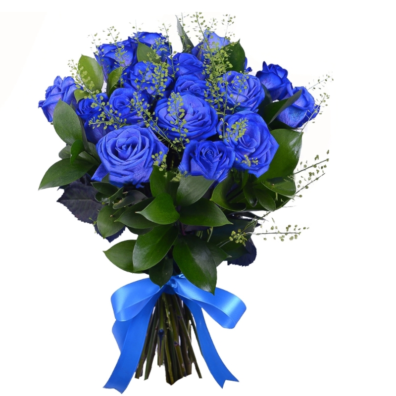 Букет состоит из 17 синих роз, зелень, прозрачная упаковка, атласная лента.
